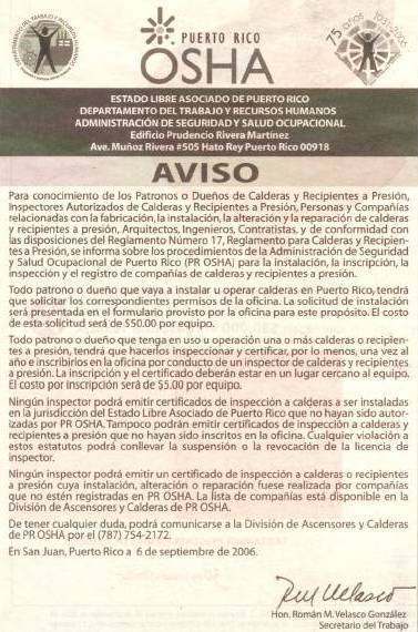 PR OSHA ANNOUNCEMENT The following announcement was published on Sept. 12, 2006 in El Nuevo Día newspaper regarding the installation and inspection of pressure vessels in Puerto Rico. To download it click here.